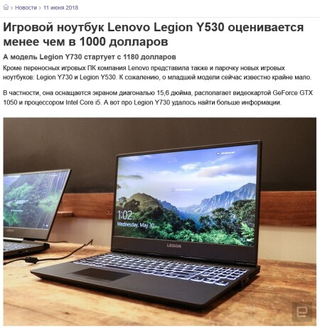 Игровой ноутбук Lenovo Legion Y530 оценивается менее чем в 1000 долларов: www.ixbt.com (02.07.18)