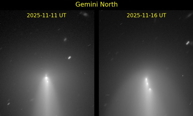 Из интересного, не связанного с «играми» NASA: недавно появился снимок, подтвердивший, что Атлас — не один объект. 16 ноября 2025 года было зафиксировано 4 объекта, выстроенных в линию. Отмечается, что форма восточного объекта явно вытянутая. Учёные называют это подтверждением того, что АТЛАС «разрушается», хотя, очевидно, существуют и другие варианты объяснения.