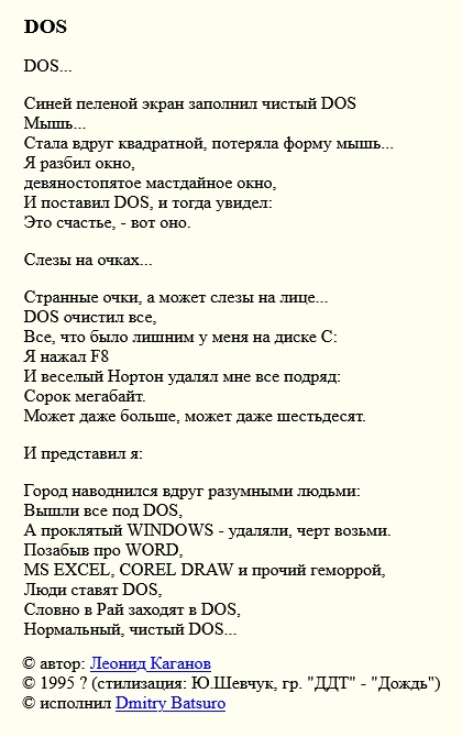 На мотив песни "Дождь" Шевчука (группа ДДТ) Леонид Каганов написал пародийную песню "DOS", Дмитрий Батсуро её спел под гитару, ну а питерские фидошники (Лиманский Андрей, Кескинов Михаил, Еслисеев Андрей, Дмитрий Корякин и еще некоторое кол-во героев второго плана, хотя не менее важных от того.) сняли клип в некоторых местах смешной до слез.