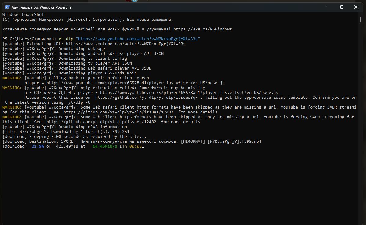 yt-dlp "https://www.youtube.com/watch?v=XXXXXXXXXXX"Обязательно заключайте URL в кавычки — если в URL есть & или другие специальные символы, команда иначе может дать ошибку.