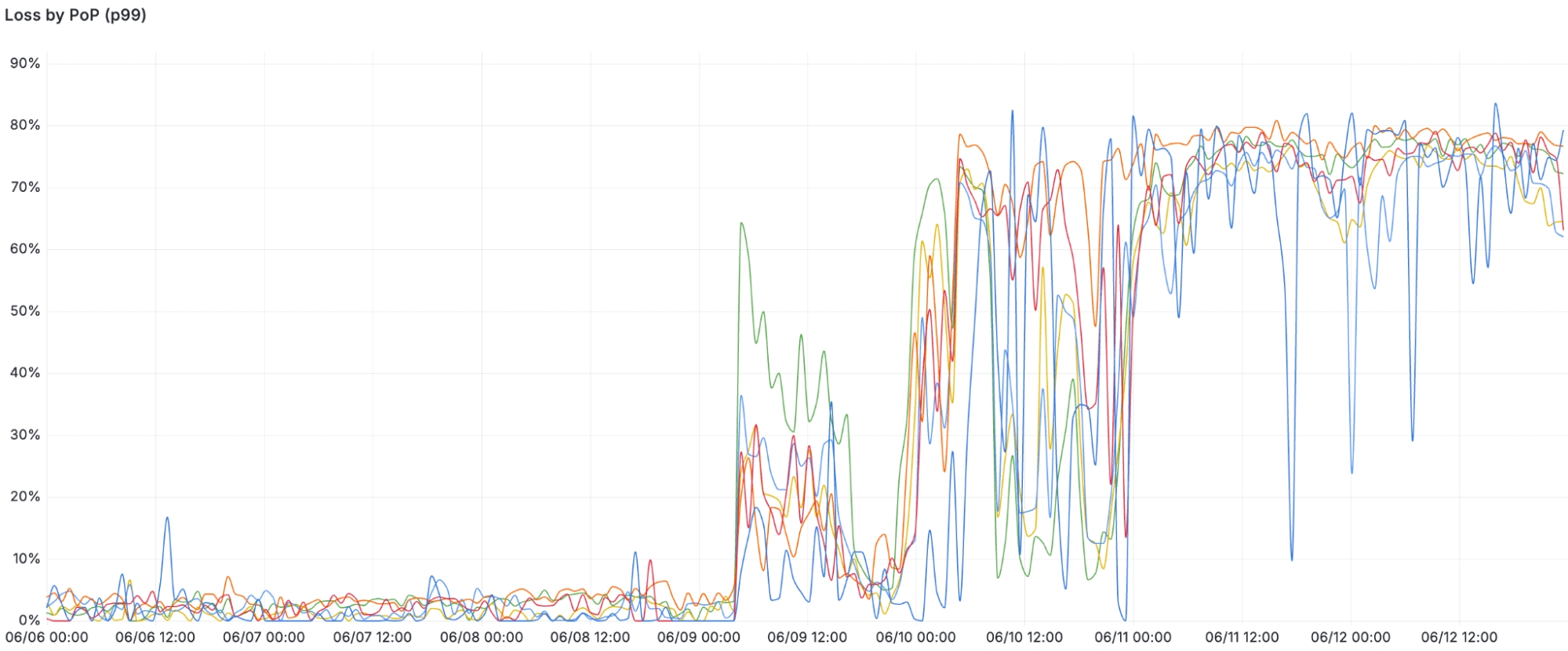 На диаграмме показана потеря пакетов в наших российских центрах обработки данных, каждый из которых представлен отдельной линией. По оси Y отложена доля потерянных пакетов