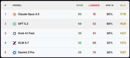 По итогам тестирования с участием пяти передовых моделей лидером стала Claude Opus 4.5 от Anthropic с 85% побед и рейтингом ELO 1778. На втором месте расположилась GPT 5.2 от OpenAI (68% побед, ELO 1625), за ней – Grok 4.1 Fast (39%), GLM 4.7 (32%) и Gemini 3 Pro (26%).